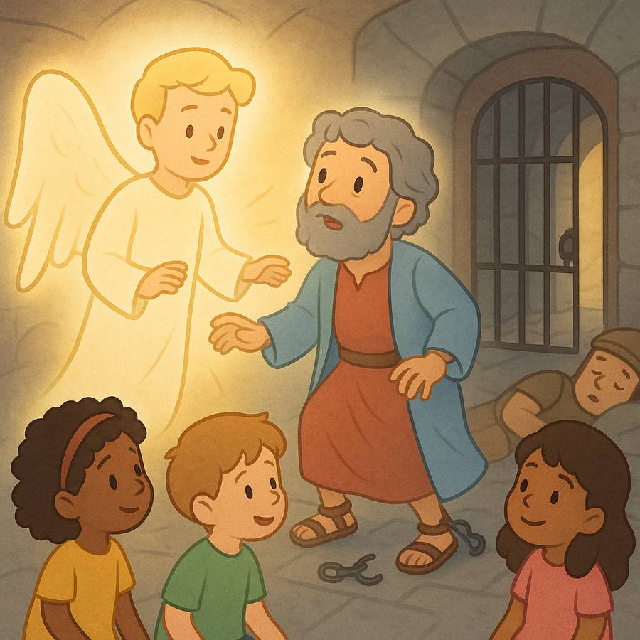 Na noite antes de Herodes querer julgar Pedro, algo incrível aconteceu. Pedro estava dormindo – sim, dormindo! Ele não parecia preocupado porque sabia que Deus estava no controle. De repente, uma luz brilhou dentro da cela. Era um anjo de Deus! O anjo tocou Pedro e disse: ‘Depressa! Levante-se!’ No mesmo instante, as correntes caíram dos pulsos de Pedro como mágica!