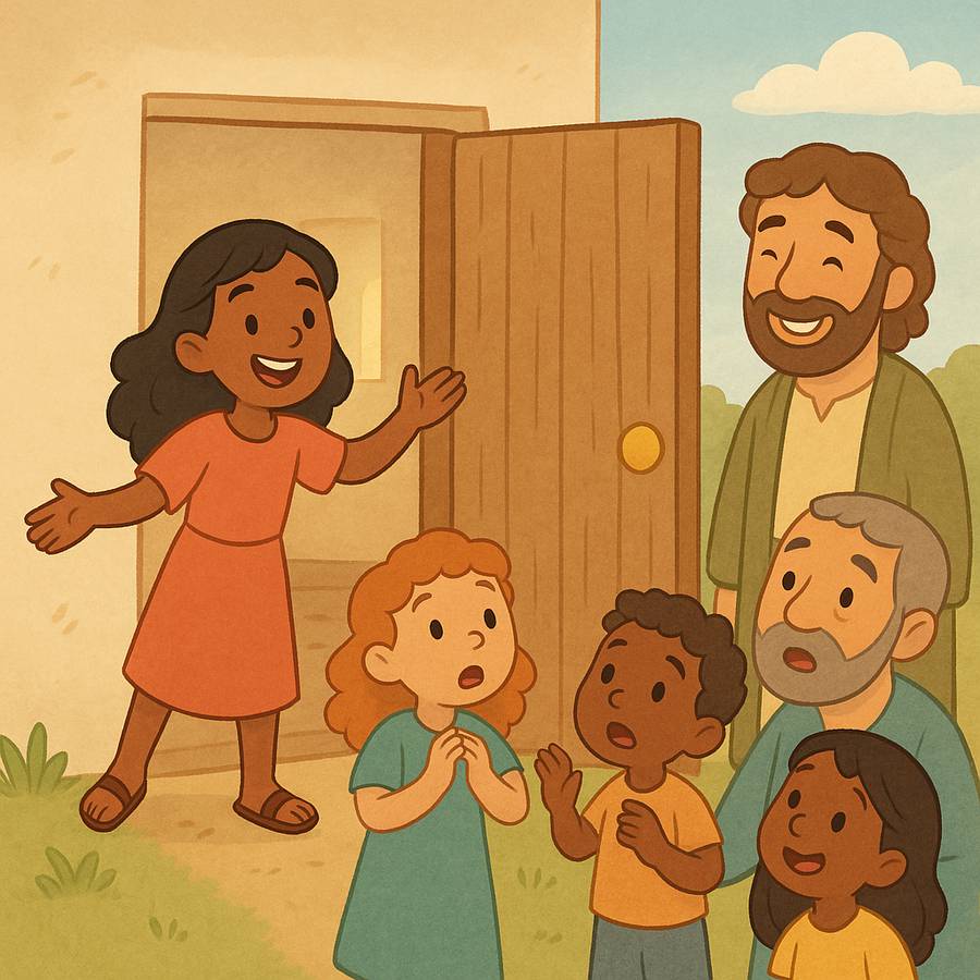 Então ele foi até a casa onde todos estavam orando por ele. Quando chegou lá, ele bateu na porta. Uma moça chamada Rode ouviu e foi atender. Quando reconheceu a voz de Pedro, ficou tão empolgada que esqueceu de abrir a porta e correu para contar aos outros: ‘É o Pedro! Ele está aqui!’ No começo ninguém acreditou nela, mas quando abriram a porta… lá estava Pedro em pé!