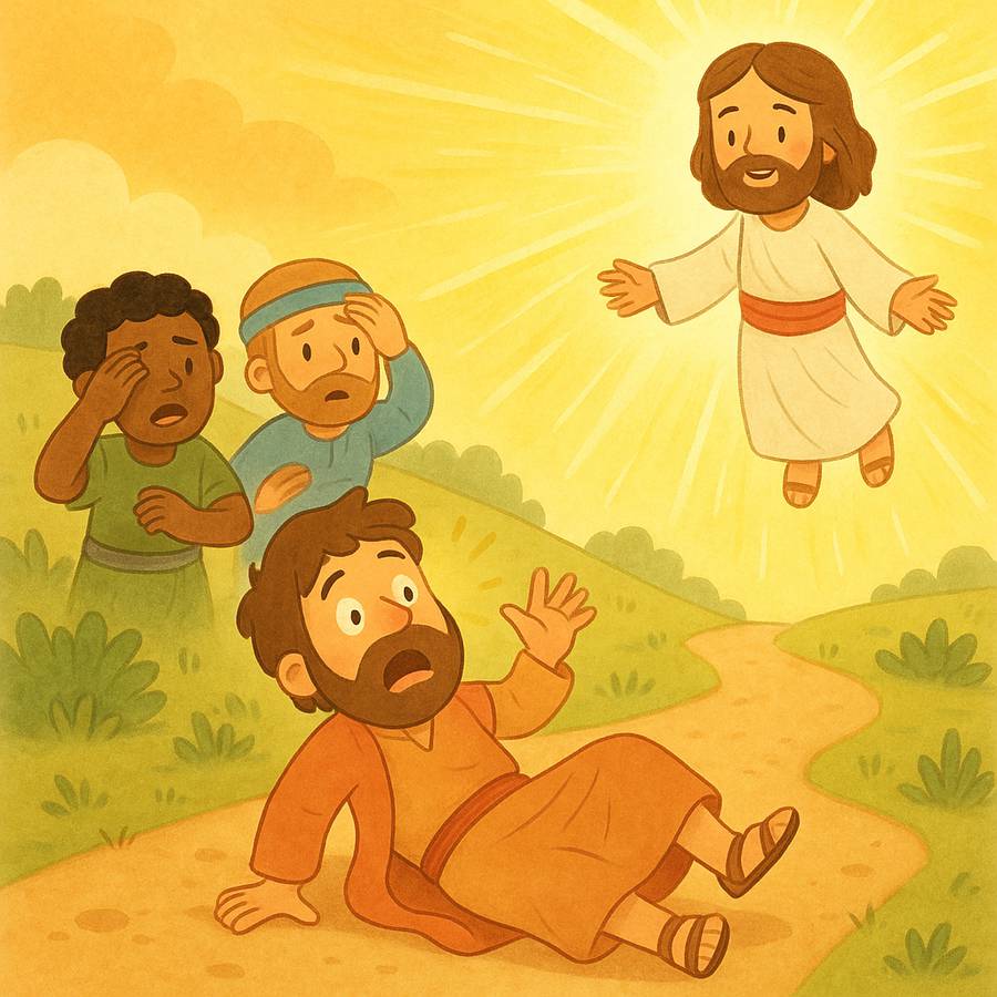 Mas algo muito especial aconteceu enquanto ele estava no caminho para Damasco. De repente, uma luz muito forte brilhou no céu, tão forte que ele caiu no chão! Então, ele ouviu uma voz dizendo: