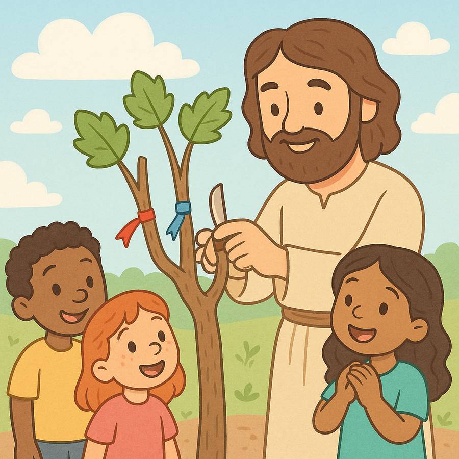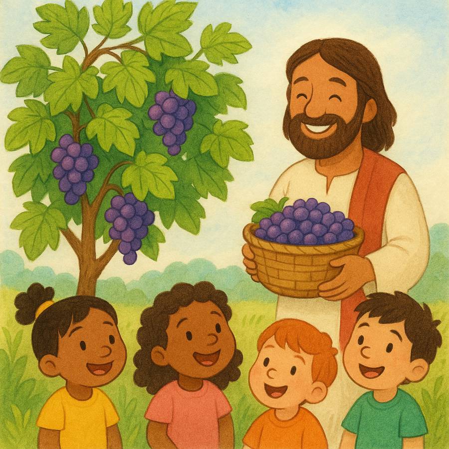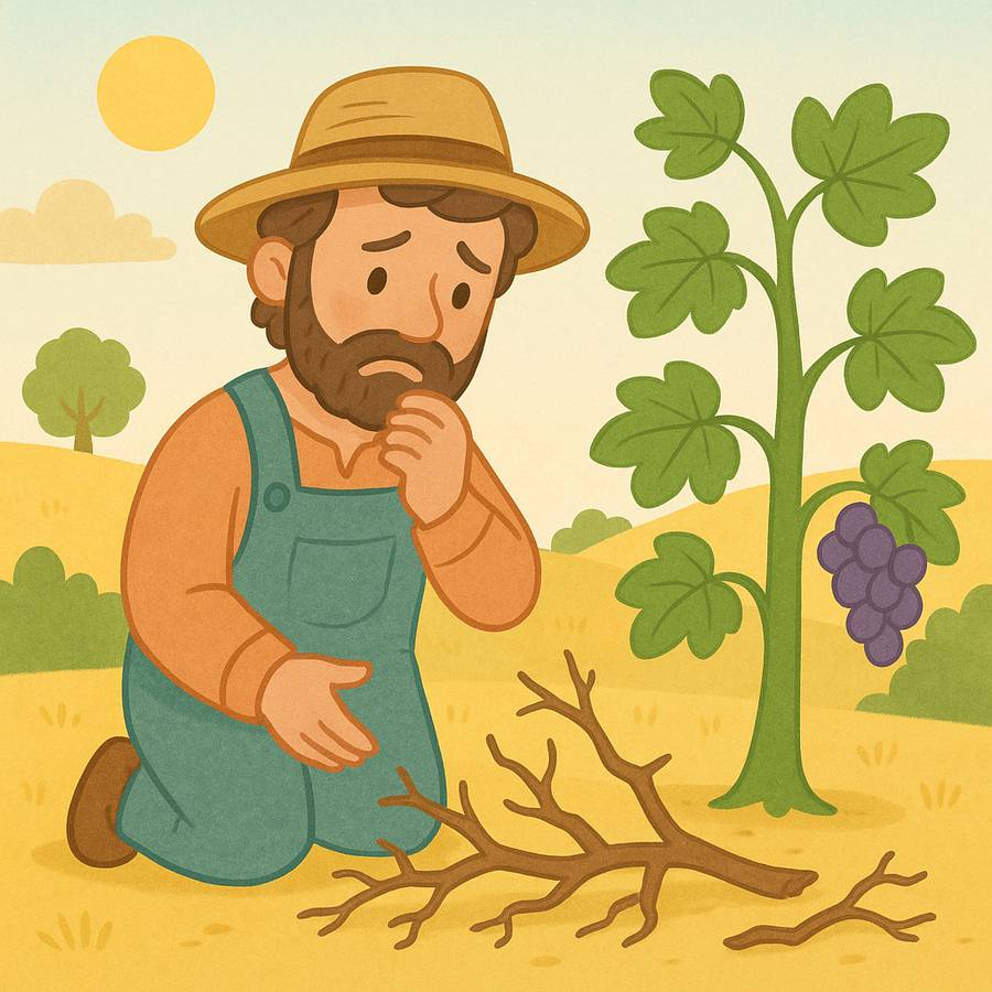 Havia um fazendeiro muito amoroso que tinha uma grande videira. Vocês sabem o que é uma videira? É uma planta onde crescem uvas docinhas! Era a planta favorita do fazendeiro, e ele cuidava dela com muita atenção. Todos os galhos estavam cheios de folhas e frutos. Mas, com o passar do tempo, alguns galhos começaram a secar porque não estavam mais ligados corretamente ao tronco principal da videira. Sem o tronco, eles não recebiam água nem nutrientes e, por isso, não podiam dar frutos.