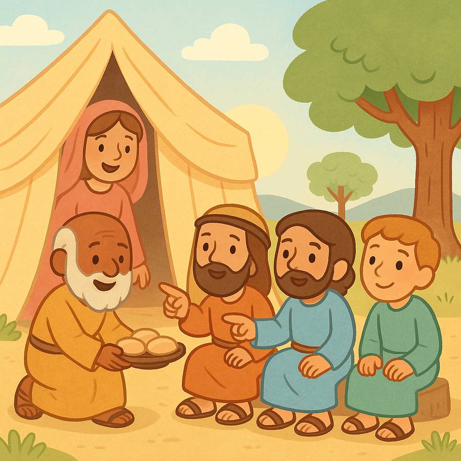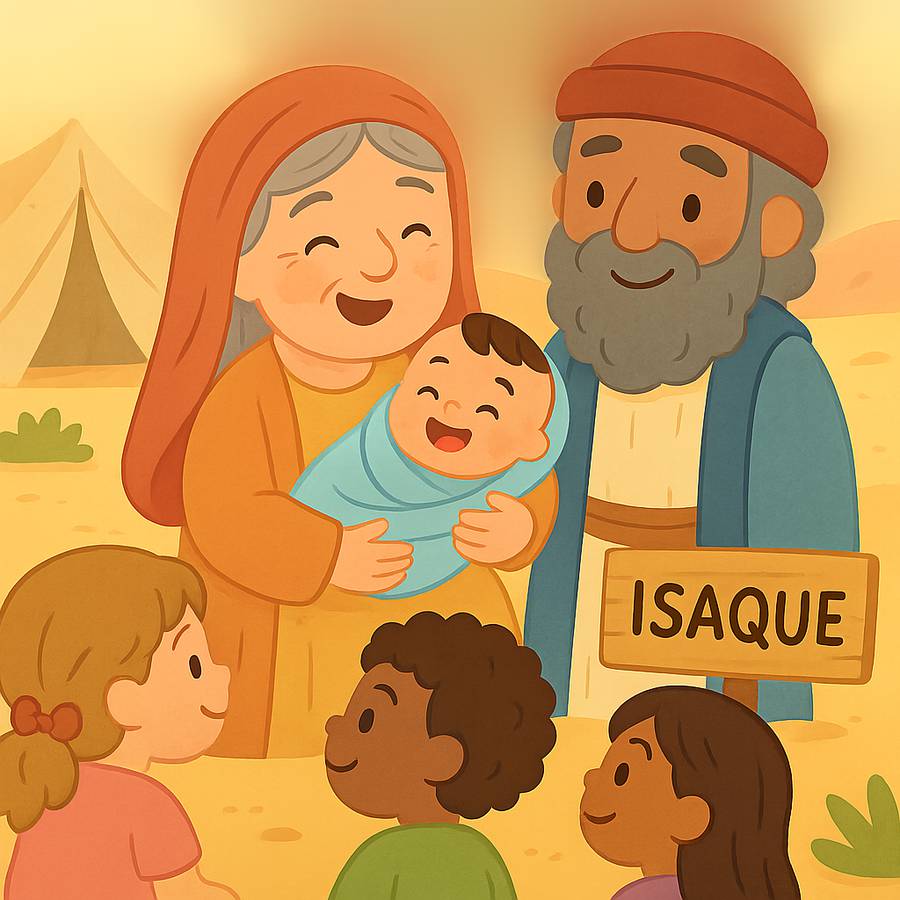 Há muito tempo, existia um homem chamado Abraão. Ele era casado com Sara, e os dois viviam felizes servindo a Deus. Mas havia algo que eles ainda sonhavam: ter filhos. Abraão já estava muito velho, e Sara também. Eles achavam que nunca poderiam ter filhos porque era tarde demais.
