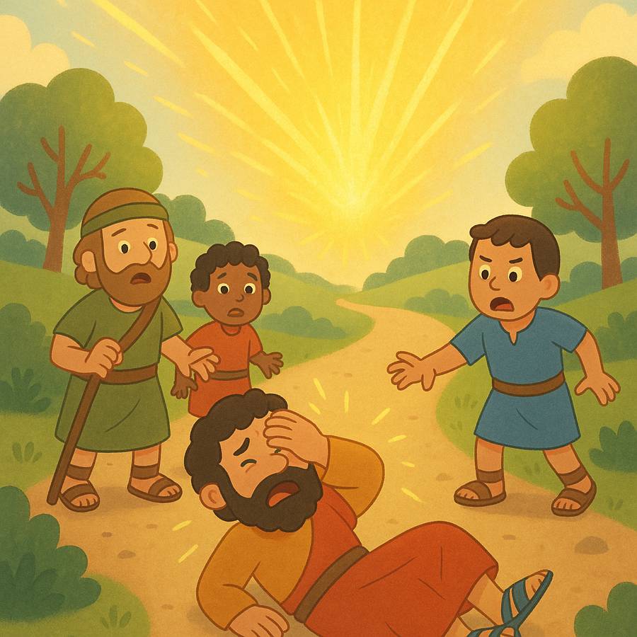 Um dia, Saulo estava viajando para uma cidade chamada Damasco. Ele tinha um plano: encontrar mais pessoas que seguiam Jesus e levá-las presas. Então, enquanto ele caminhava pela estrada, uma luz brilhante — mais forte do que o sol! — apareceu no céu e o deixou tão cego que ele caiu no chão.