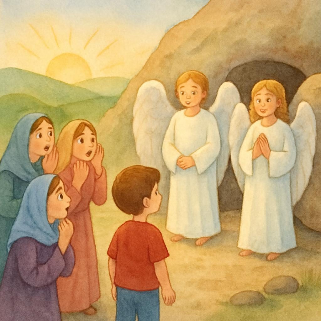Jesus morreu e foi colocado em um túmulo. Seus amigos estavam tristes porque achavam que era o fim… Mas não era o fim! No terceiro dia depois da Sua morte, algo incrível aconteceu: Ele ressuscitou! Quando as mulheres foram visitar o túmulo vazio, um anjo disse a elas: